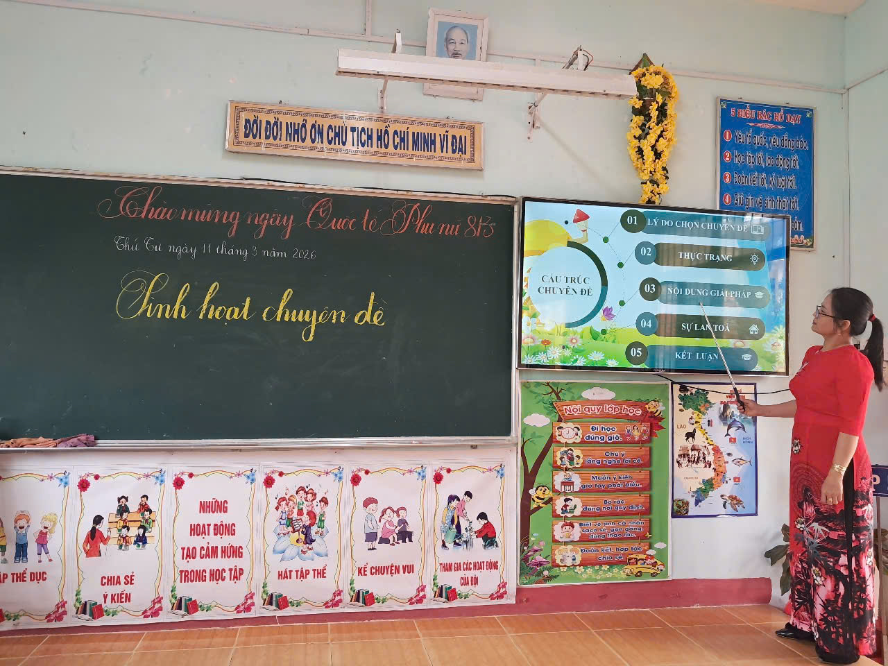 Buổi sinh hoạt chuyên môn có sự tham gia của Ban giám hiệu cùng toàn thể giáo viên trong nhà trường. Nội dung sinh hoạt tập trung vào việc dạy minh họa và dự giờ, phân tích bài học và trao đổi kinh nghiệm giảng dạy, giúp giáo viên cùng nhau nghiên cứu cách tổ chức hoạt động học tập cho học sinh một cách hiệu quả.