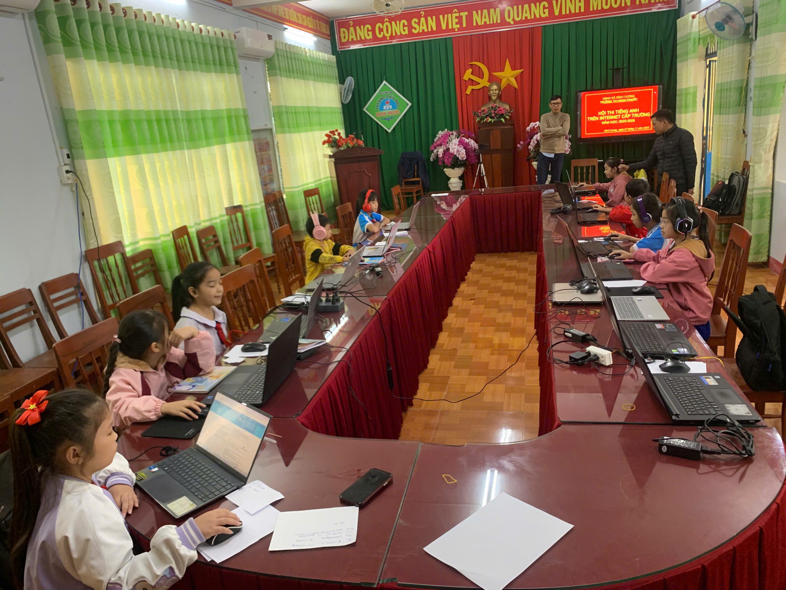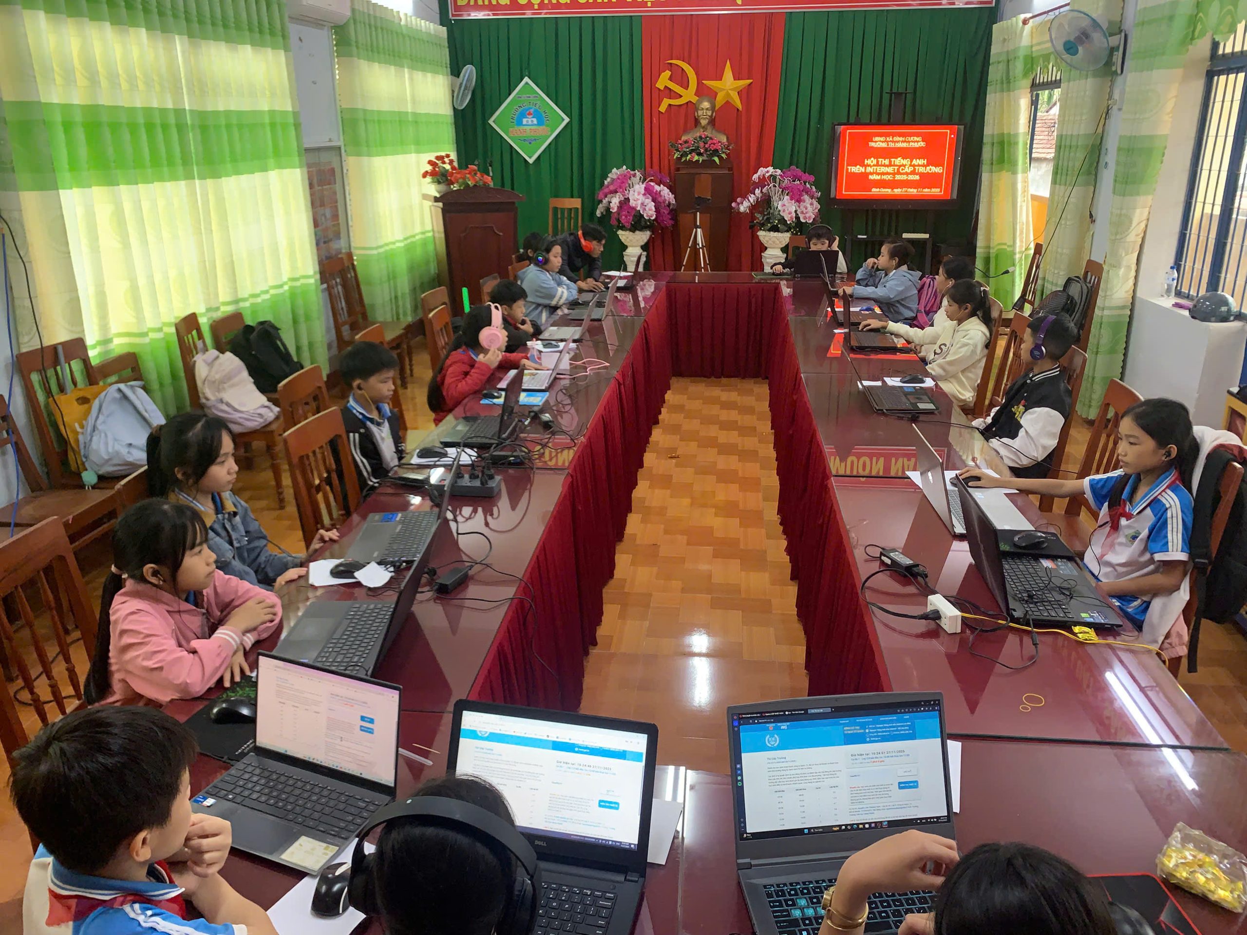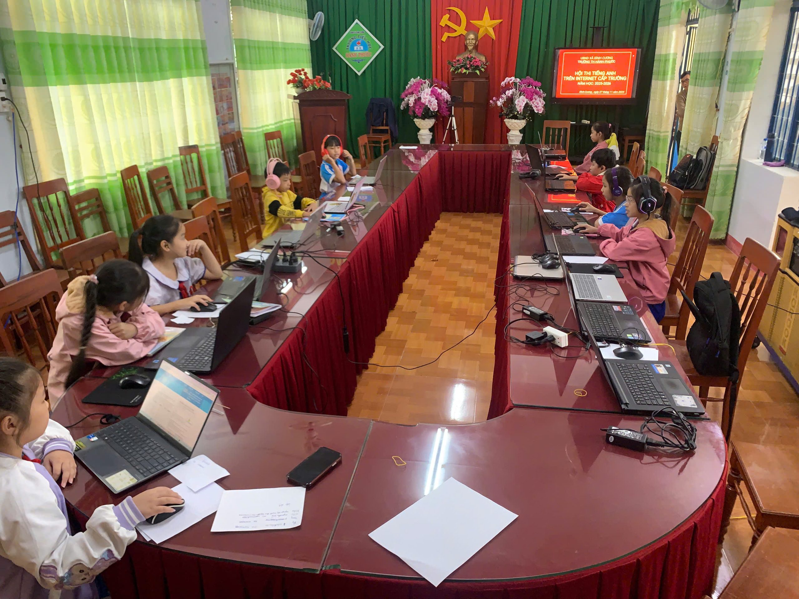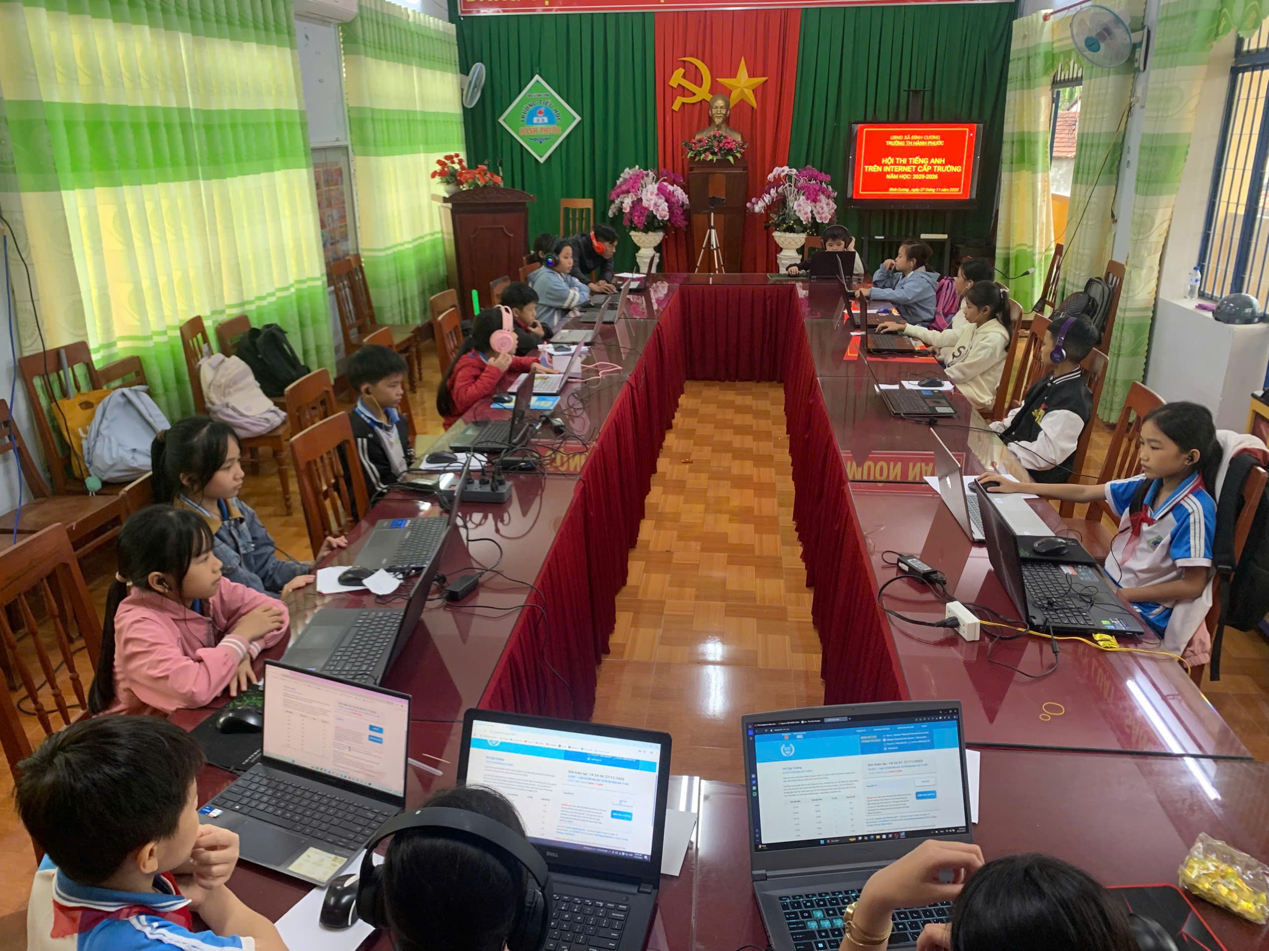 Sáng nay, tại phòng hội đồng của nhà trường, các em học sinh đã tham gia kỳ thi tiếng Anh qua Internet (IOE) cấp trường.