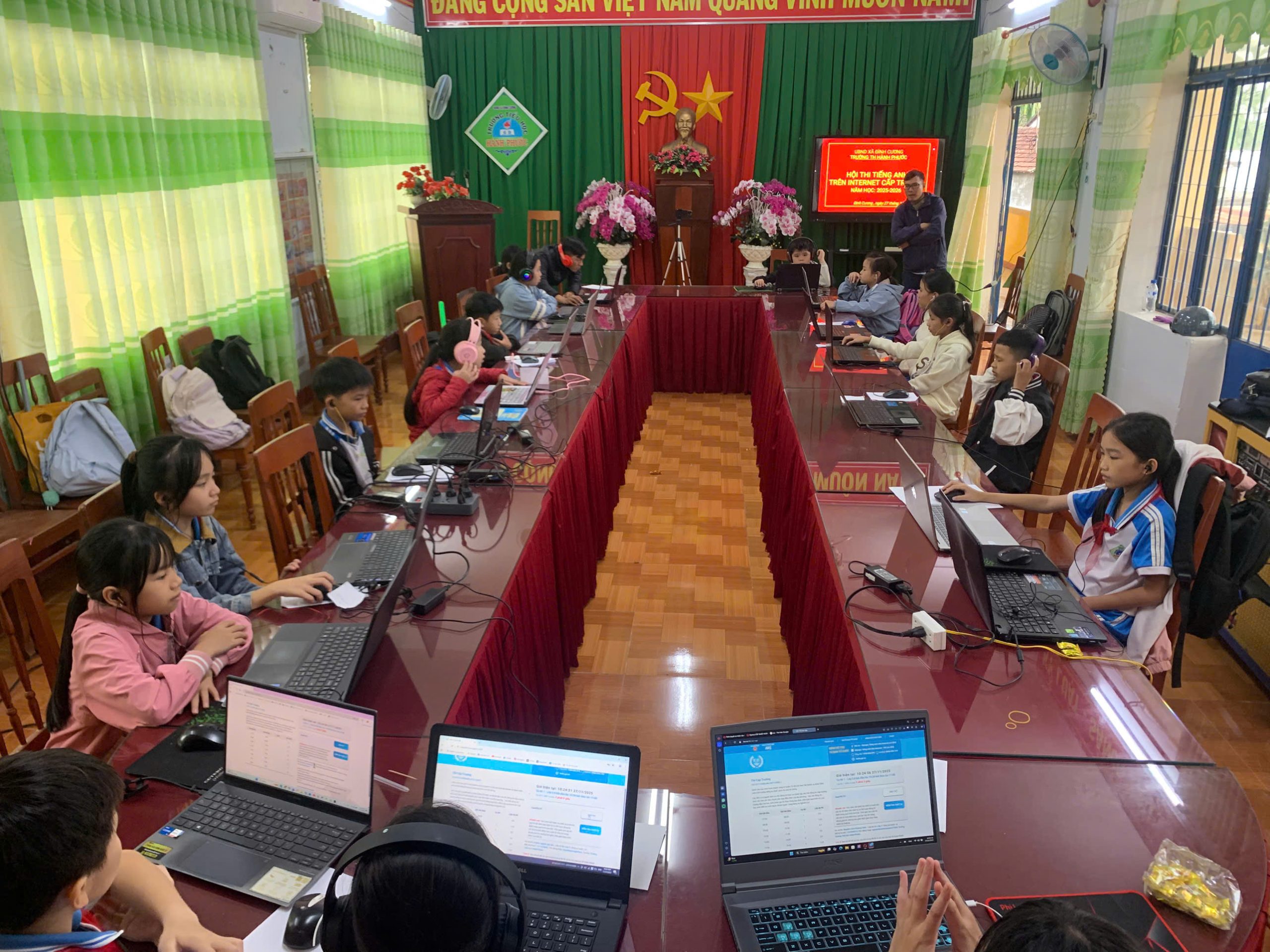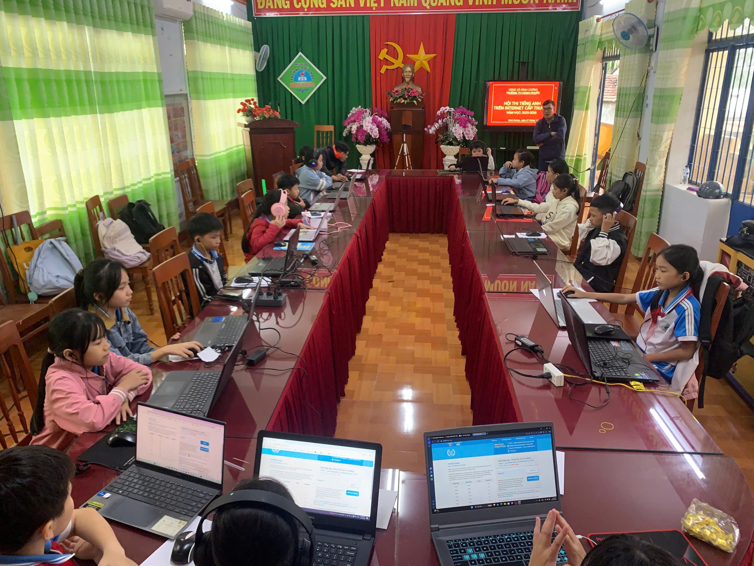 Bên cạnh đó, các thầy cô giáo luôn có mặt để hướng dẫn quy trình vào phòng thi, hỗ trợ kỹ thuật và động viên các em trước giờ làm bài. Nhờ sự chuẩn bị chu đáo của nhà trường, máy tính được chuẩn bị đầy đủ, kết nối ổn định, giúp các em yên tâm thể hiện năng lực của mình.
