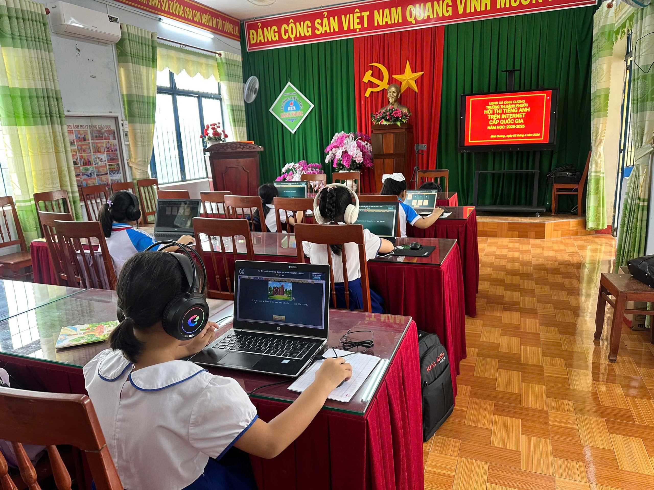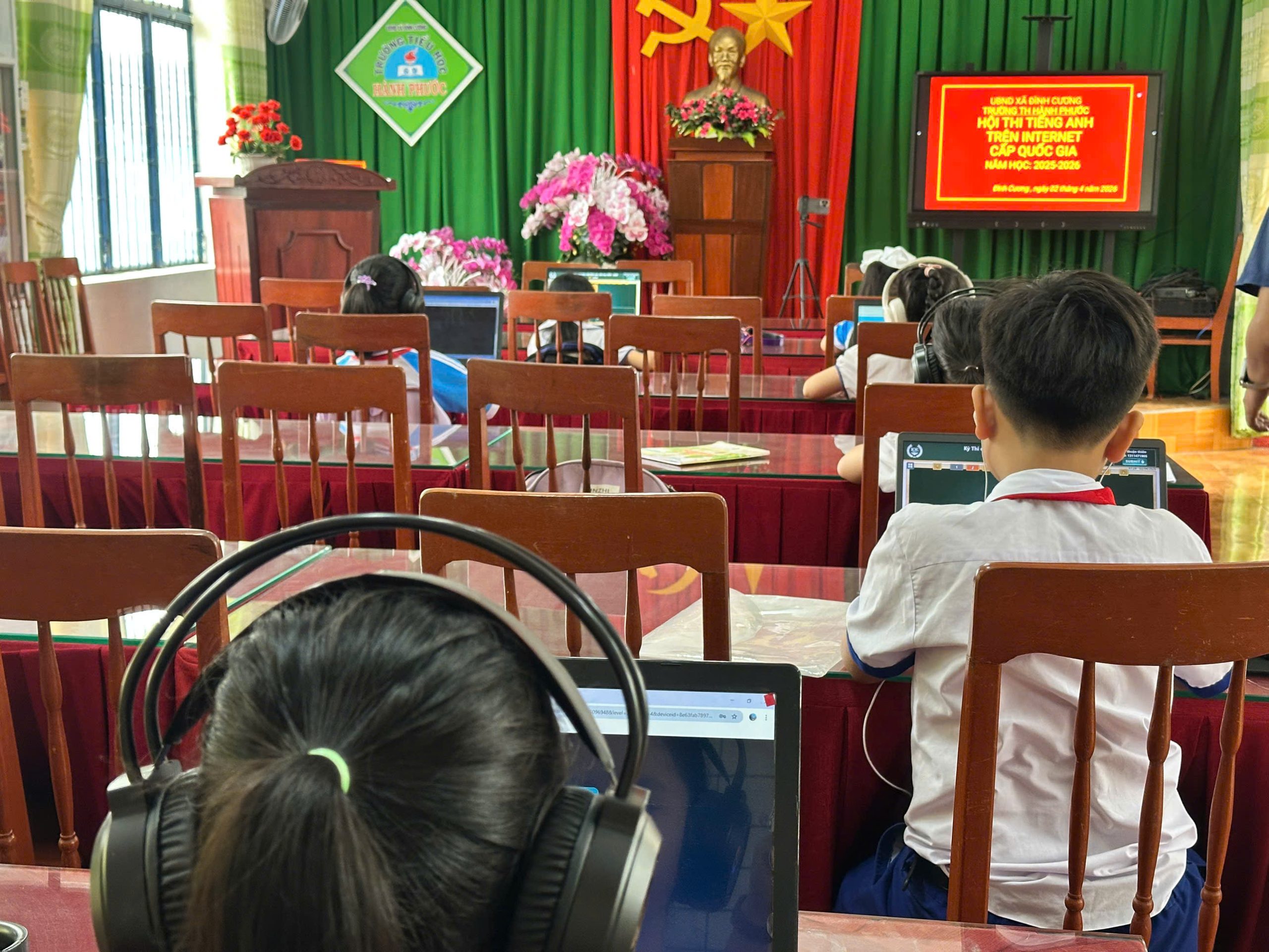 Tham gia kỳ thi là những học sinh tiêu biểu đã xuất sắc vượt qua các vòng thi cấp trường, cấp xã và cấp tỉnh. Các em thể hiện tinh thần tự tin, bản lĩnh và khả năng sử dụng Tiếng Anh linh hoạt thông qua các bài thi trực tuyến hấp dẫn, đa dạng về nội dung và hình thức.